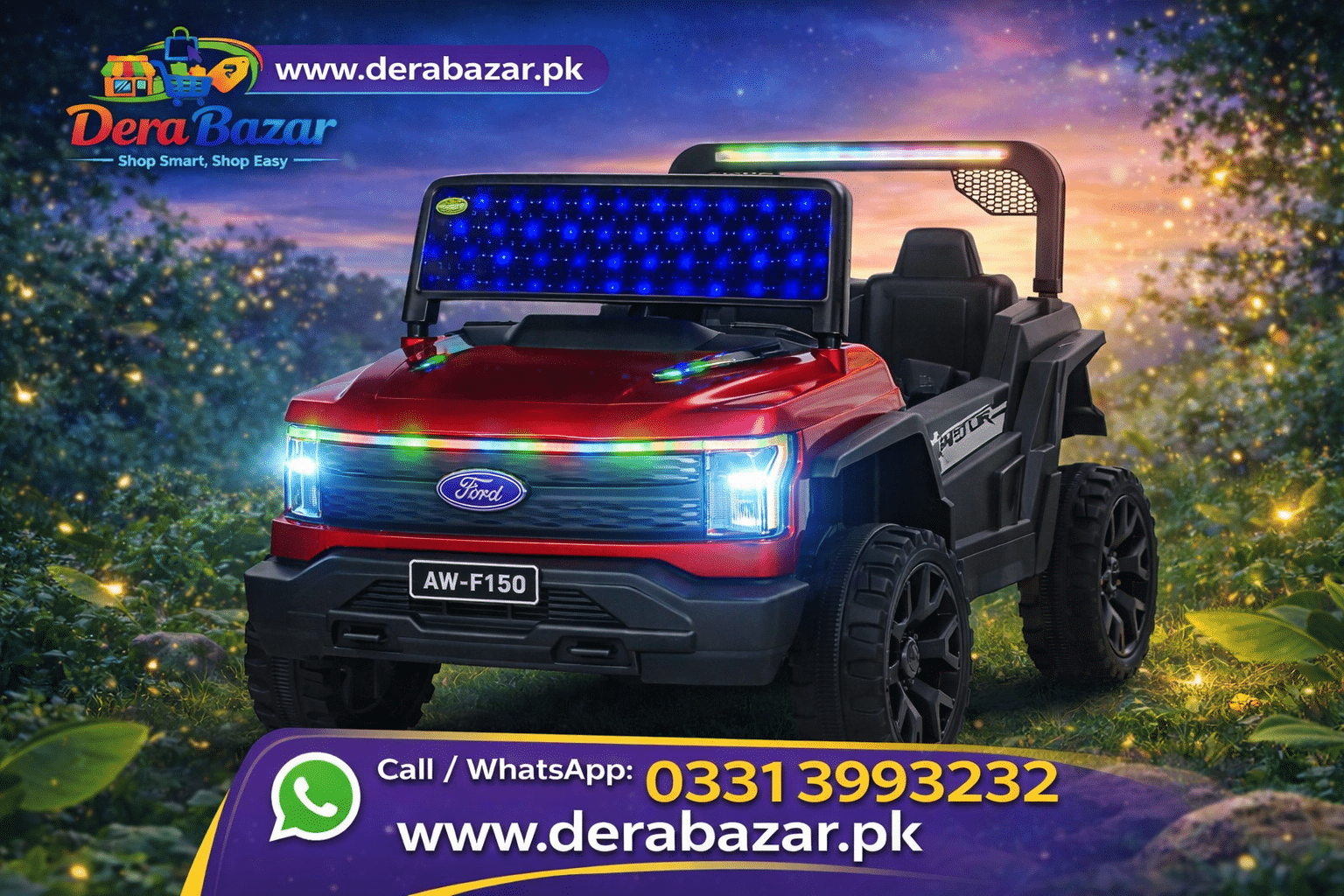 Give your child an exciting driving experience with this stylish Ford F-150 inspired electric ride-on jeep. Featuring LED headlights, colorful roof lights, strong wheels, and a comfortable seat, it is perfect for kids who love adventure and fun.