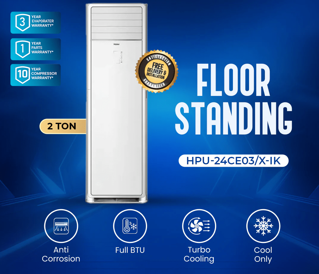 Powerful Cooling Meets Smart Efficiency. The Haier HPU-24CE03/X-IK is a 2-ton commercial floor-standing unit designed to tackle large spaces with ease. Featuring advanced Energy Saving Technology that reduces power consumption by up to 40%, this unit ensures a comfortable environment without the skyrocketing utility bills. Built for reliability, it operates across a wide voltage range, making it the perfect choice for areas with fluctuating power grids.