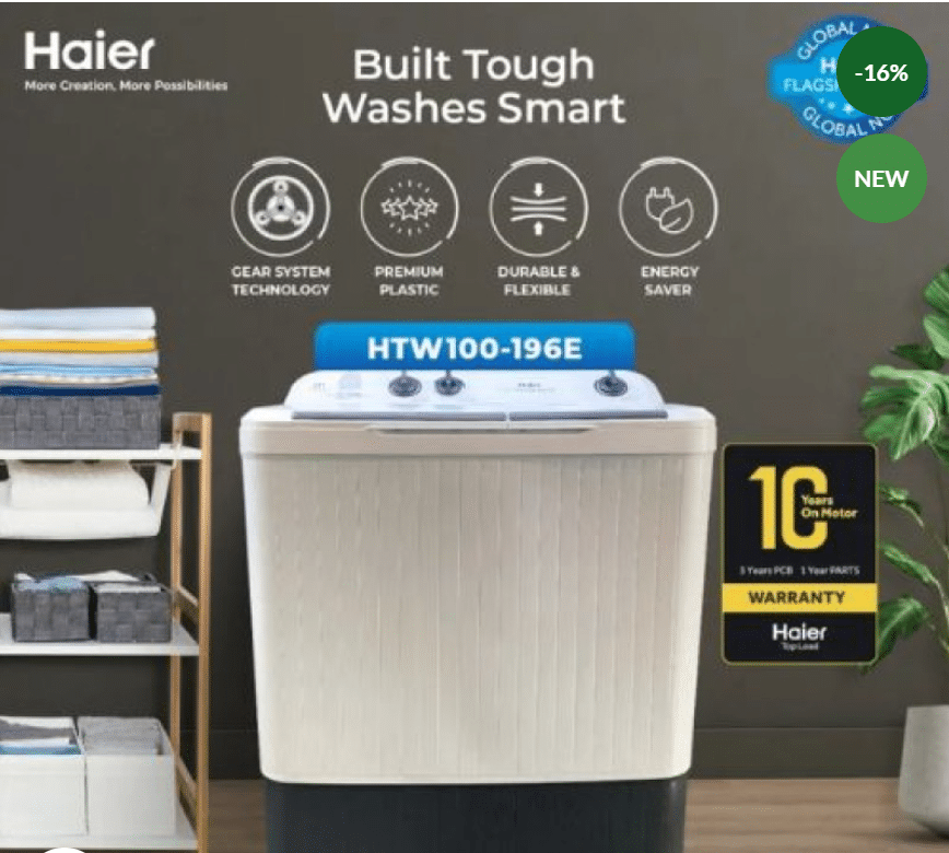 The Haier HTW100-196E is the ultimate “workhorse” for large households. With its 10kg washing capacity, it is one of the largest semi-automatic models available, allowing you to wash king-size blankets, curtains, and massive family loads in one go. Its dual-tub design gives you the flexibility to wash and spin-dry simultaneously, saving you hours of time.