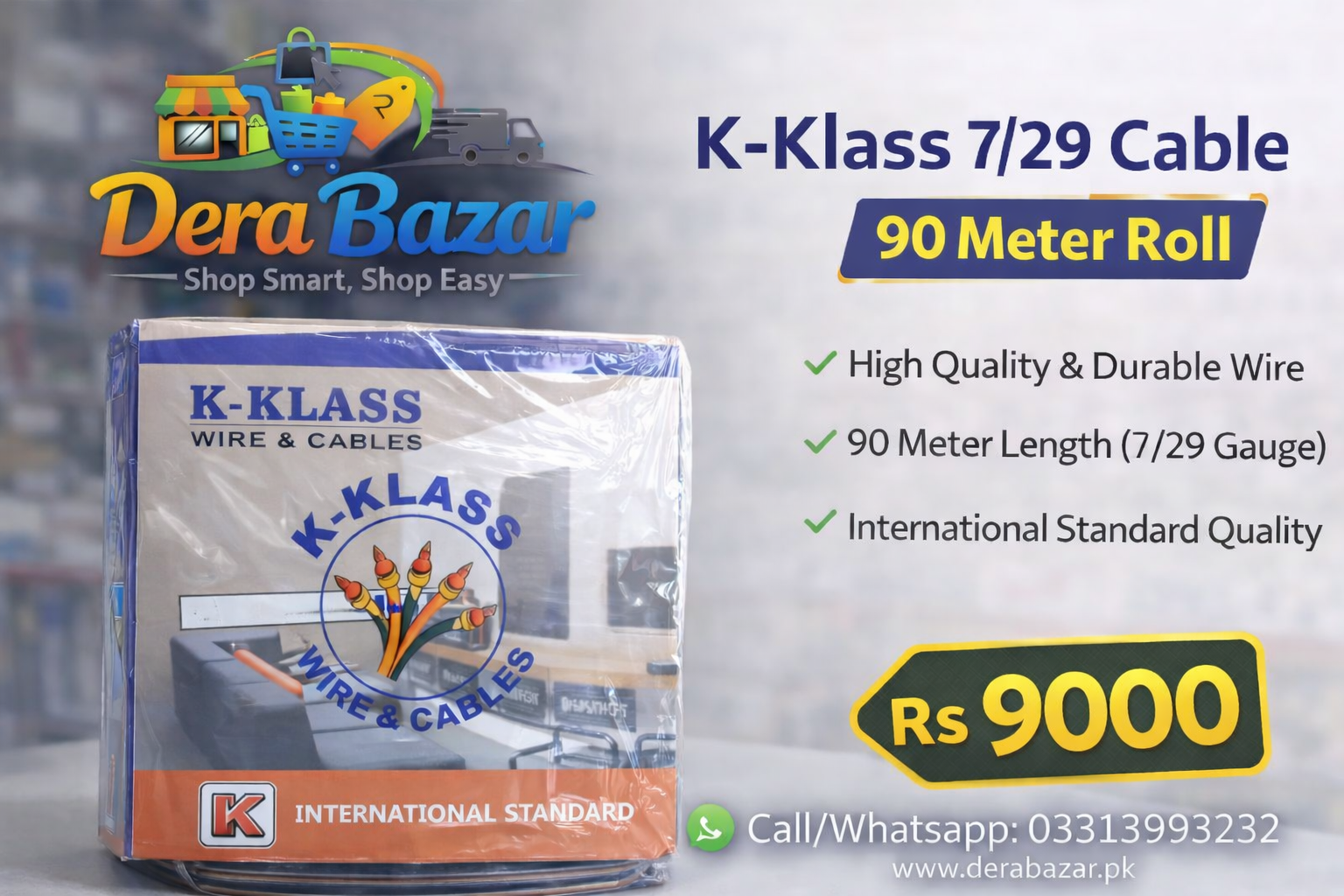 K-Klass 7/29 Cable (90 Meter Roll) – Premium quality electrical wire designed for safe and efficient power transmission. Ideal for house wiring, switches, and electrical installations. Manufactured to international standards for durability and performance.
