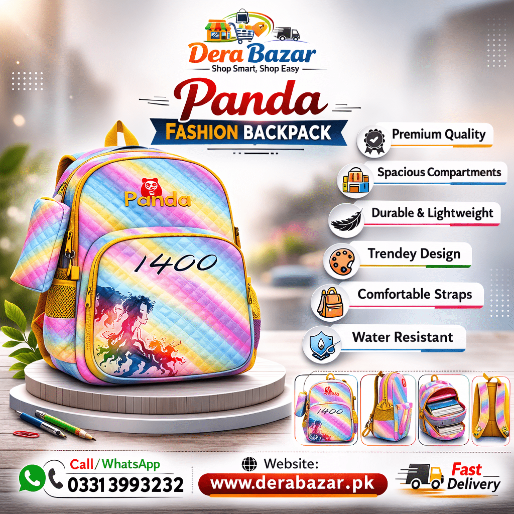 Stylish and colorful Panda Fashion Backpack designed for school, travel, and daily use. Lightweight, spacious, and made with durable material. Comfortable straps and trendy rainbow design make it perfect for kids and teens.
